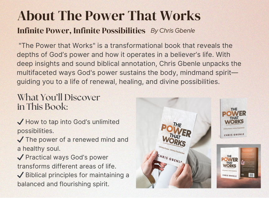 The Power that Works' Infinite Power, Infinite Possibilities by Chris Gbenle gives insight into unlocking the power of God's unlimited possibilities. It unpacks the multifaceted ways in which God's power operates in a believer's life, interpreting with fine balance and sound annotation the rich menu of God's great power in keeping a person's body, mind, and spirit in a healthy state.